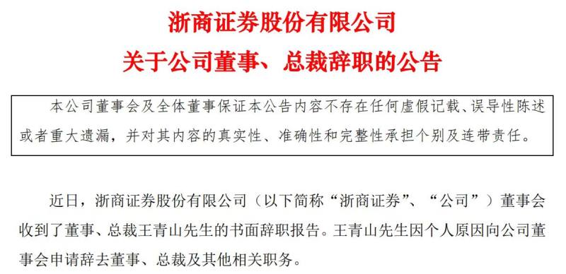 5月12日,浙商证券发布公告官宣了总裁王青山的职务变动。公告显示,近日,浙商证券董事会收到了董事、总裁王青山的书面辞职报告。王青山因个人原因向公司董事会申请辞去董事、总裁及其他相关职务。