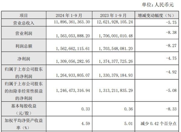 今年1-9月,公司实现营业收入118.96亿元,同比下降5.75%;实现净利润13.09亿元,同比下降4.75%;实现归属于上市公司股东的净利润12.65亿元,同比下降4.92%,较上半年有所收窄。