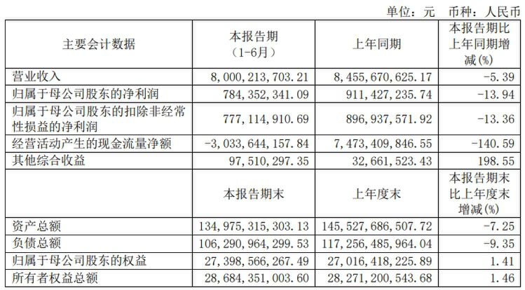 今年上半年,公司实现营业收入80亿元,同比下降5.39%;归母净利润7.84亿元,同比下降13.94%;基本每股收益为0.20元。