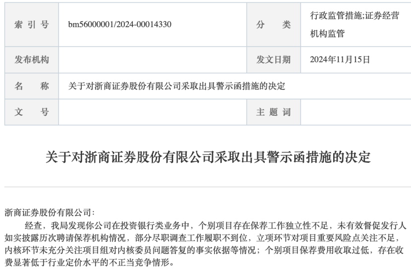同时,浙江证监局还指出,浙商证券还存在个别项目保荐费用收取过低,存在收费显著低于行业定价水平的不正当竞争情形。综合起来,决定对该公司采取出具警示函的监督管理措施,并记入证券期货市场诚信档案。