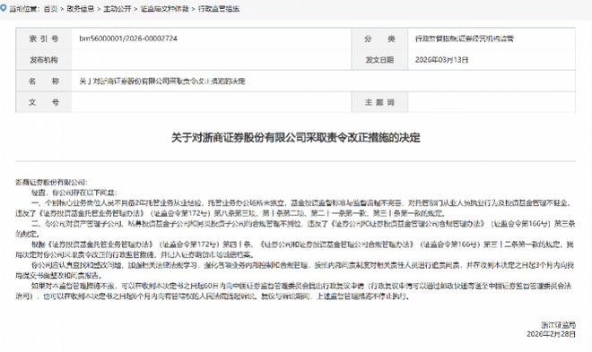浙江证监局表示,决定对浙商证券采取责令改正的行政监管措施,并记入证券期货市场诚信档案。