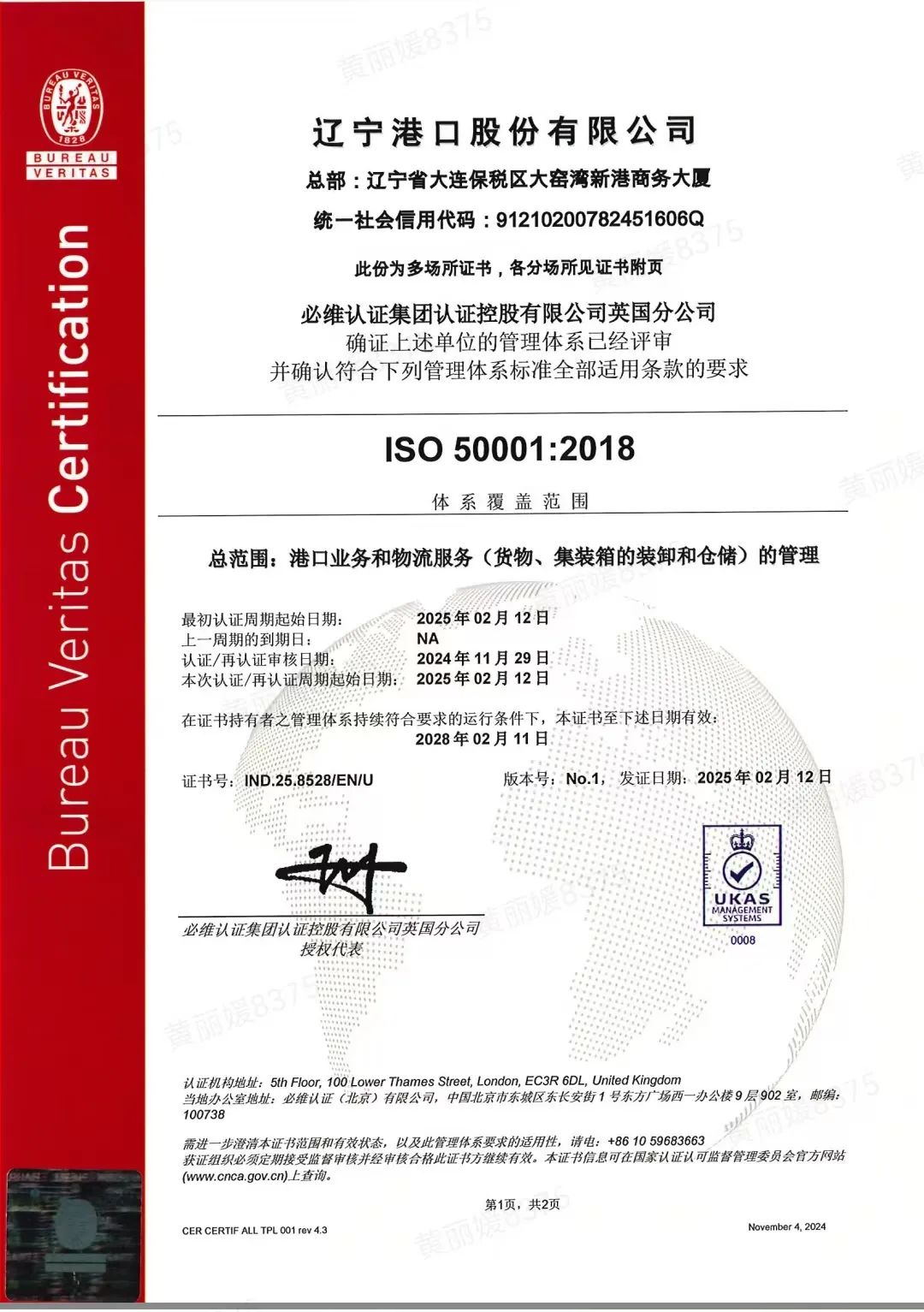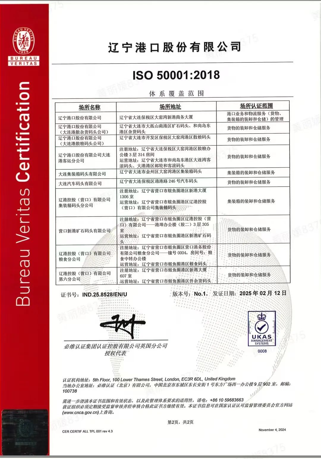 近日,经国家认证认可监督管理委员会批准,辽港股份及下属大连港散杂货码头分公司、大连港散粮码头分公司、大连港客运分公司、大连集装箱码头公司、大连汽车码头公司、营口港集装箱码头公司、营口新港矿石码头公司、营口港粮食公司、营口港六公司9家单位获得必维认证集团认证控股有限公司英国分公司颁发的覆盖范围为港口业务和物流服务(货物、集装箱的装卸和仓储)管理的“能源管理体系认证证书”,成为辽港集团首批通过此认证的单位,标志着辽港在能源使用、能源消耗及能源效率等方面的管理工作达到了更高标准。