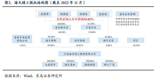 公司实际控制人为张静章、张剑鸣、张静来、钱耀恩先生,截至 2022 年 11 月,合计直接和间接持有公司 53.82%的股份。其中张静章通过海天股份、安信香港、海天天富间接控制公司 27.7%的股份,其子张剑鸣通过海天股份、安信香港、海天天富间接持有公司 9.17%的股份,并接受海天企业管理委托的海天股份 26.83%股权的投票表决权等权利,个人合计持有海天精工 19.55%的股份。