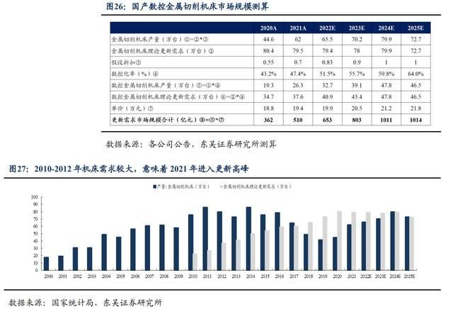 我们以国家统计局公布的产量数据为基础测算,2022-2025 年金属切削机床每年的理论更新需求有望达 80 万台,假设平均单价 15 万元/台,则每年更新的规模将达 1200 亿元。