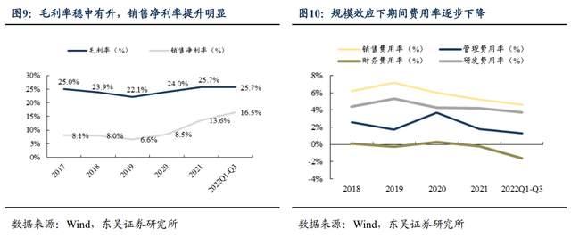 2)随着公司产能逐步释放,规模效应愈发明显,盈利能力持续提升。2019 年至 2022Q1-Q3 公司毛利率从 22.1%提升至 25.7%,销售净利率从 6.6%提升至 16.5%,期间费用率从 15%下降至 7.8%。