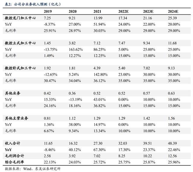 ③数控卧式加工中心:公司卧式加工中心业务收入较为稳定,毛利率始终保持在较高水平,未来随着新能源汽车等领域对卧式加工中心需求增加,公司相关业务有望保持较快增长。我们预计 2022-2024 年公司数控卧式加工中心业务收入增速分别为 23%/30%/30%,毛利率维持在 35.0%。