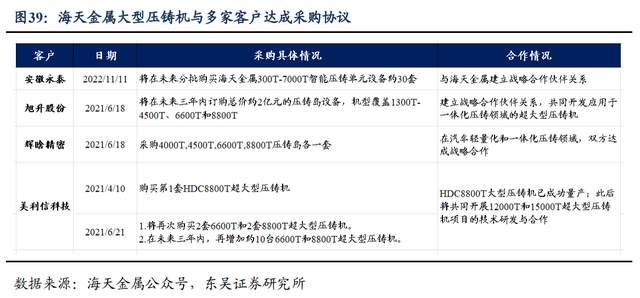 2021 年 12 月海天金属向美利信交付首台 8800T 大型压铸机,成为全球唯四的大型压铸机生产商(其余包括力劲科技、布勒和伊之密),后续与辉晗精密、旭升股份等多家公司签订超大型压铸机战略协议。