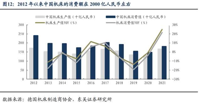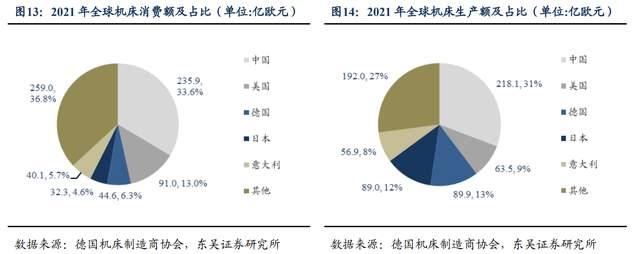 根据德国机床制造商协会对世界机床行业统计调查数据,2021 年全球机床消费为 702.9 亿欧元,中国机床消费为 235.9 亿欧元,全球占比为 34%;生产与消费类似,2021 年全球机床产值为 709.5 亿欧元,中国作为世界第一大机床生产国,2021年产值约为 218.1亿欧元,全球占比为 31%。