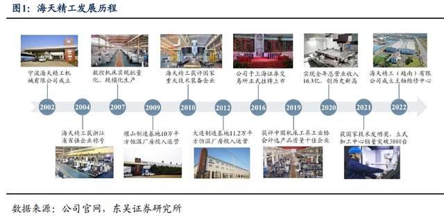 海天精工成立于 2002 年,成立以来专注于中高档数控机床的研发、生产及销售,以大型龙门加工中心起家,稳固行业地位后逐步拓展产品品类至卧式加工中心、立式加工中心等,下游涉及航空航天、汽车、5G、工程机械等众多领域。