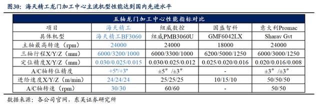 通过筛选出国内外知名度较高,产品应用较多的龙头公司的龙门加工中心进行对比,可以发现海天精工的五轴龙门加工中心在主轴最高转速及三轴行程等指标方面已达国际领先水平,在定位精度/AC轴转位精度/进给速度/AC 轴转速等指标方面,虽然较国际领先企业略有差距,但与国内同类产品相比,具有一定竞争优势。