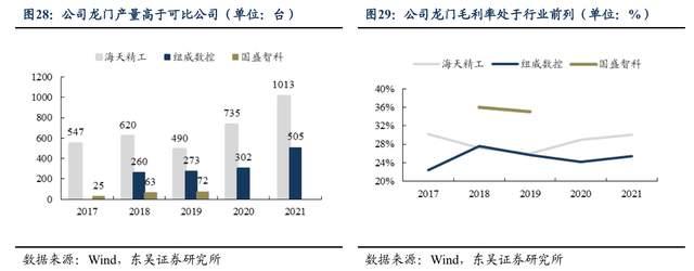 1)龙门加工中心产量高于国内可比公司:选择国内主要龙门生产企业纽威数控和国盛智科进行对比,公司 2020-2021 年龙门产量均为纽威数控产量的两倍以上,2017-2019 年产量远高于国盛智科龙门产量。