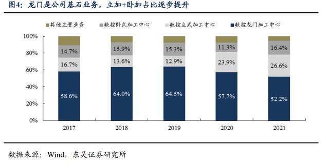 分业务收入占比来看,龙门加工中心是公司基石业务,2017-2021 年营收占比始终高于 50%,主要系公司在该领域积累良好的口碑和客户资源,市场认可度较高。
