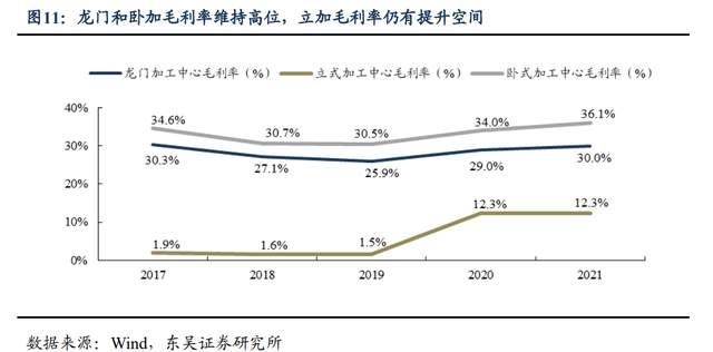 在龙门业务精益求精的基础上,公司积极拓展产品品类,卧加、立加等产品已得到市场认可。2019-2021年公司立加收入占比从 12.9%提升至 26.6%,卧加收入占比从 15.3%提升至 16.4%,均实现较快发展。