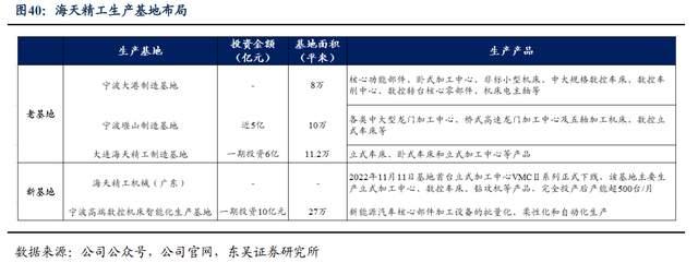 目前公司拥有宁波大港制造基地、宁波堰山制造基地、大连海天精工制造基地三个主要生产基地,2021 年龙门加工中心、卧式加工中心和立式加工中心等合计产量达 4882 台,产销率高达 89%。