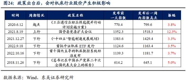 其中具体来看,制造业周期上行时期,例如 2021 年 8 月 19 日国资委党委扩大会议指出支持工业母机行业发展后,指数在一周内振幅高达 12%;而在制造业周期下行时期,政策支持出台后一周内指数振幅在 3-5%之间。