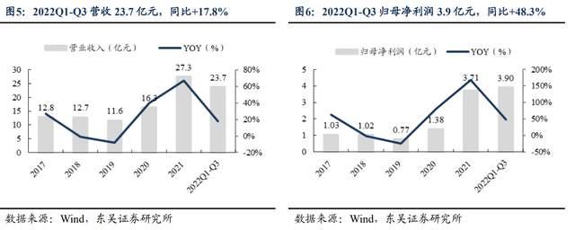 2022Q1-Q3实现营收 23.7亿元,同比+17.8%,归母净利润 3.9亿元,同比+48.3%,业绩增速略有放缓,主要受到华东疫情反复及制造业景气度下滑影响。