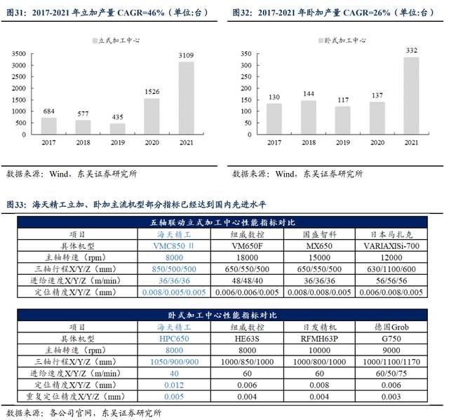 公司在保持大型龙门领先地位的同时,充分利用募投资金扩建产能,实现立加和卧加的规模化生产;立式加工中心产量由 2017 年的 684 台上升到 2021 年的 3109 台,CAGR=46.0%。卧式加工中心产量由 2017 年的 130 台上升到 2021 年的 332 台,CAGR=26.4%,均实现较快发展。此外通过不断的研发投入,公司立加和卧加的部分指标已经达到国内先进水平。