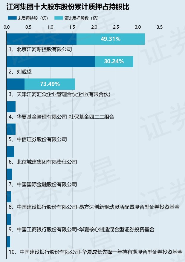 截止本公告日,股东北京江河源控股有限公司已累计质押股份1.56亿股,占其持股总数的49.31%,股东刘载望已累计质押股份8750.0万股,占其持股总数的30.24%,股东天津江河汇众企业管理合伙企业(有限合伙)已累计质押股份1.15亿股,占其持股总数的73.49%。本次质押后江河集团(601886)十大股东的累计质押股份占持股比例见下图: