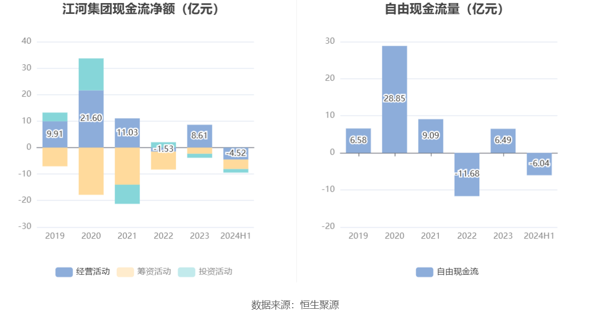 2024年上半年,公司经营活动现金流净额为-4.52亿元,同比增加7.99亿元;筹资活动现金流净额-3.60亿元,同比减少11.24亿元;投资活动现金流净额-1.34亿元,上年同期为-1.28亿元。