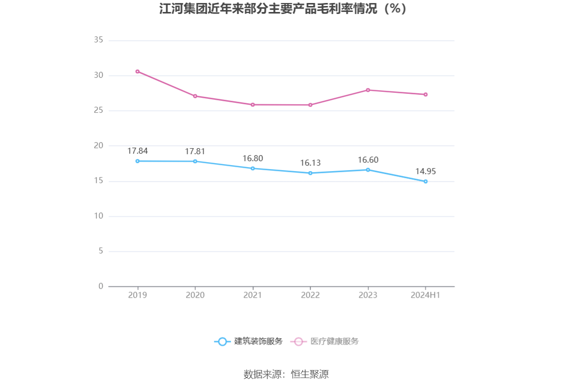 分产品看,建筑装饰服务、医疗健康服务2024年上半年毛利率分别为14.95%、27.31%。
