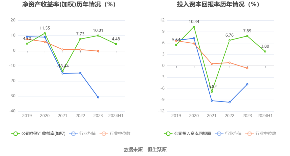 数据显示,2024年上半年公司加权平均净资产收益率为4.48%,较上年同期增长0.02个百分点;公司2024年上半年投入资本回报率为3.80%,较上年同期增长0.01个百分点。