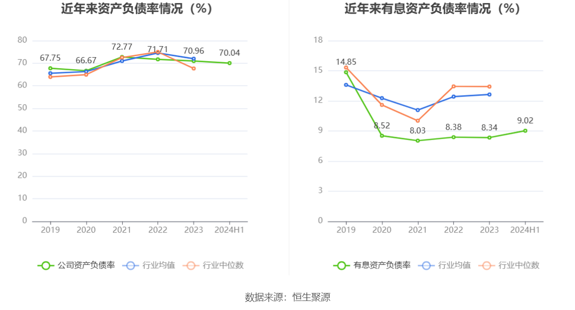 在偿债能力方面,公司2024年上半年末资产负债率为70.04%,相比上年末下降0.92个百分点;有息资产负债率为9.02%,相比上年末上升0.68个百分点。