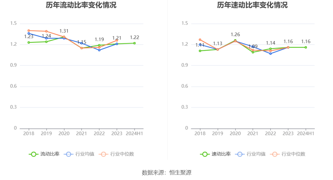 2024年上半年,公司流动比率为1.22,速动比率为1.16。