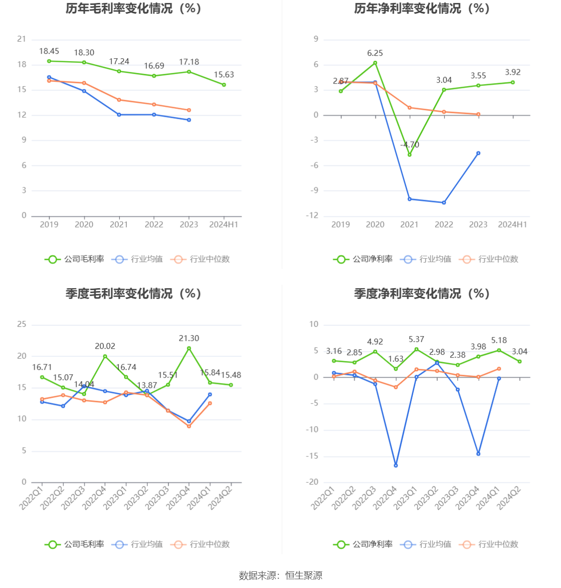 2024年上半年,公司毛利率为15.63%,同比上升0.65个百分点;净利率为3.92%,较上年同期上升0.02个百分点。从单季度指标来看,2024年第二季度公司毛利率为15.48%,同比上升1.61个百分点,环比下降0.36个百分点;净利率为3.04%,较上年同期上升0.06个百分点,较上一季度下降2.14个百分点。