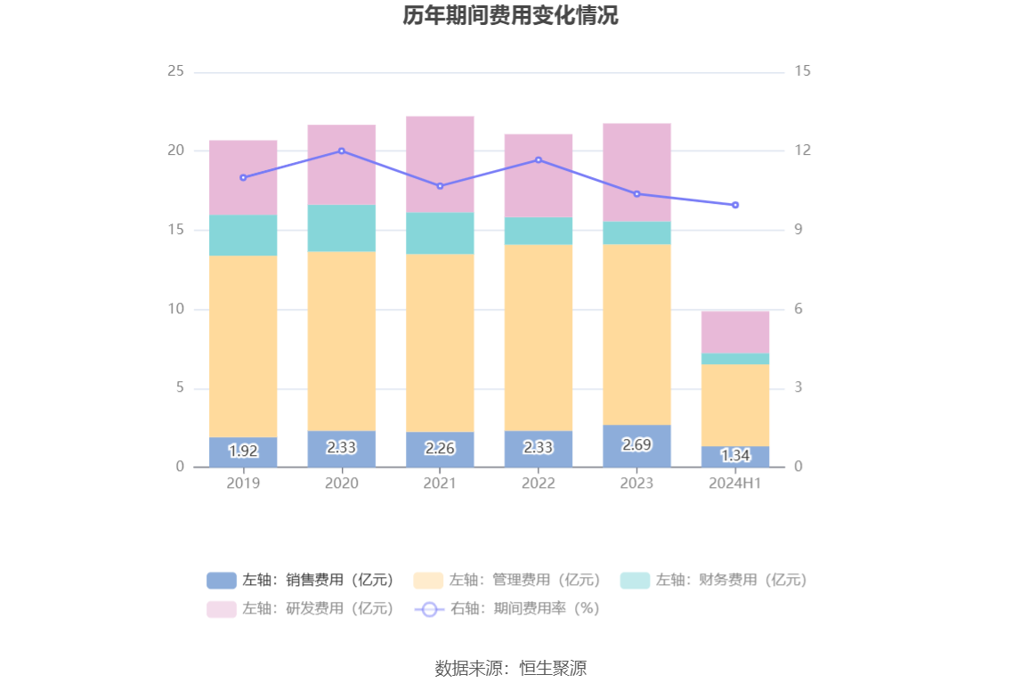 2024年上半年,公司期间费用为9.88亿元,较上年同期增加9427.40万元;但期间费用率为9.96%,较上年同期下降0.14个百分点。其中,销售费用同比增长25.51%,管理费用同比增长12.49%,研发费用同比增长7.32%,财务费用同比下降10.47%。