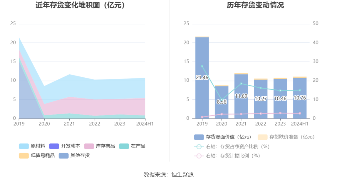 从存货变动来看,截至2024年上半年末,公司存货账面价值为10.76亿元,占净资产的14.99%,较上年末增加3022.04万元。其中,存货跌价准备为3047.41万元,计提比例为2.75%。