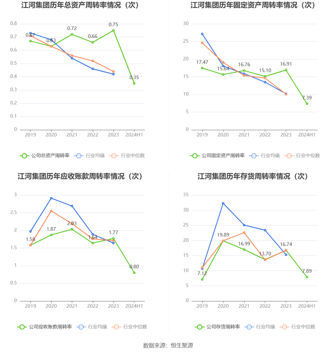 营运能力方面,2024年上半年,公司总资产周转率为0.35次,上年同期为0.32次(2023年上半年行业平均值为0.19次,公司位居同行业4/24);固定资产周转率为7.39次,上年同期为7.06次(2023年上半年行业平均值为4.60次,公司位居同行业9/24);公司应收账款周转率、存货周转率分别为0.80次、7.89次。
