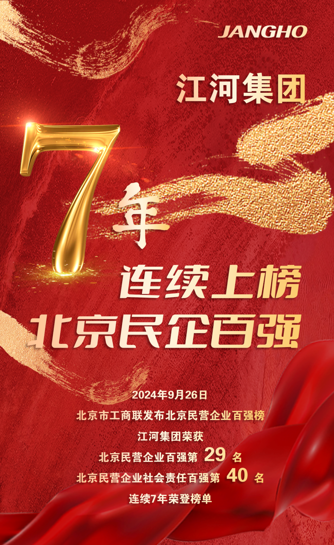 2024年9月26日下午,在刚刚发布的北京市民营企业百强榜单上,江河集团以209亿元的营业收入,跃居北京市民营企业百强第29位,较上一年度晋升4位。这也是江河集团第7年蝉联该榜单,展现了其稳健的发展力和卓越的市场表现。