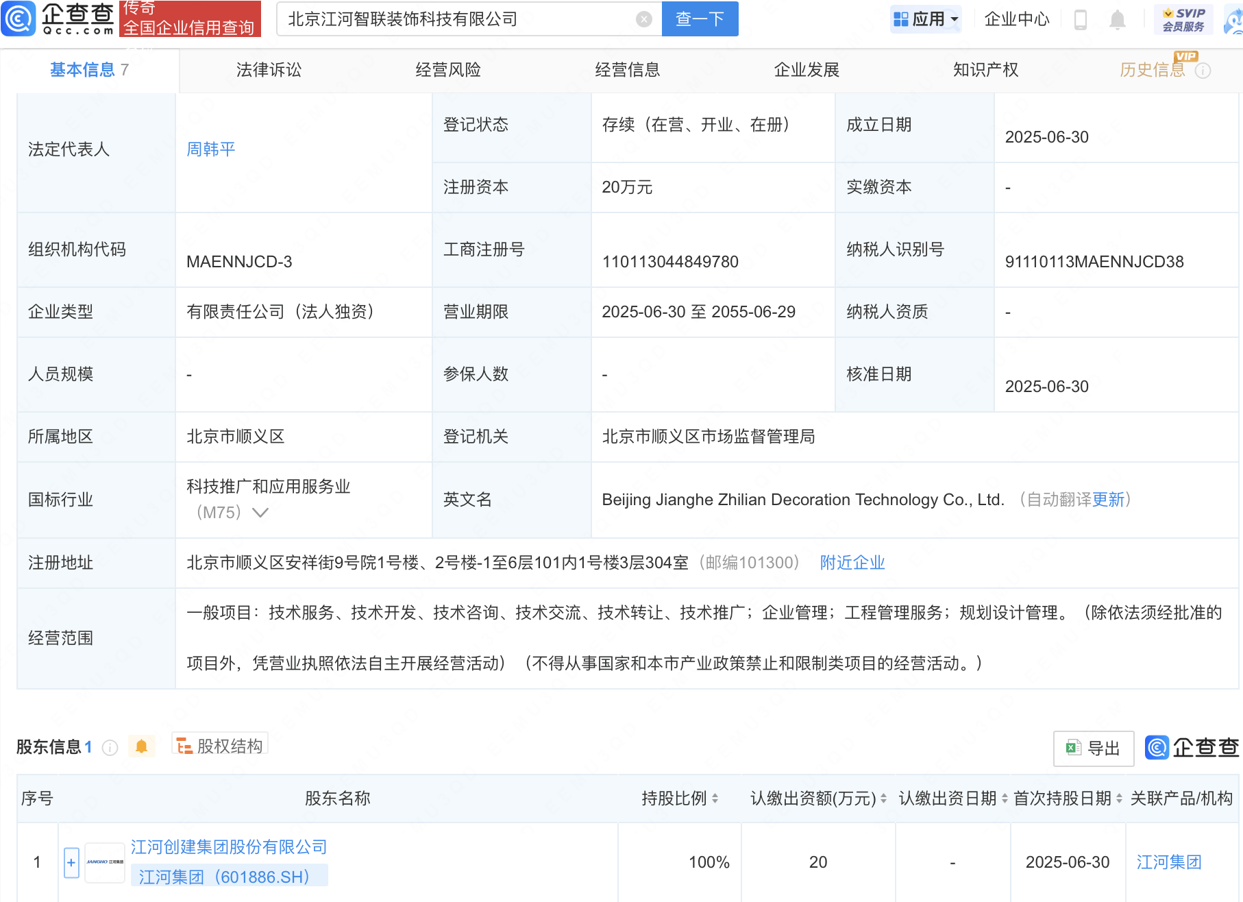 近日,北京江河智联装饰科技有限公司成立,法定代表人为周韩平,经营范围包含:企业管理;工程管理服务;规划设计管理等。股权穿透显示,该公司由江河集团(601886)全资持股。