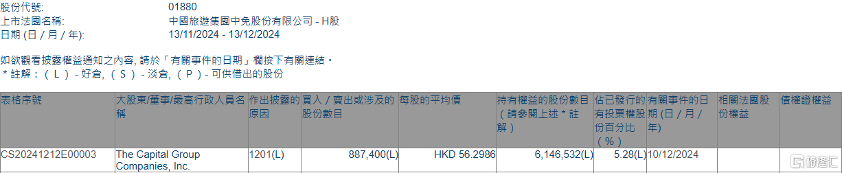 格隆汇12月13日丨根据联交所最新权益披露资料显示,2024年12月10日,中国中免(01880.HK)遭The Capital Group Companies, Inc.在场内以每股均价56.2986港元减持88.74万股,涉资约4994.94万港元。