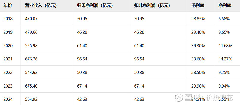 2023年:复苏但未达峰值:疫情防控优化后,消费回暖,营收恢复至675亿元(接近2021年水平),但净利润仅恢复至67.1亿元(较2021年仍有30%差距),主因毛利率下滑(29.9%,较2021年下降3.7个百分点)。