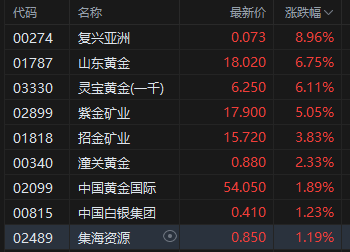 3月18日,港股黄金股持续冲高,复兴亚洲涨近9%,山东黄金、灵宝黄金涨超6%,紫金矿业涨超5%。