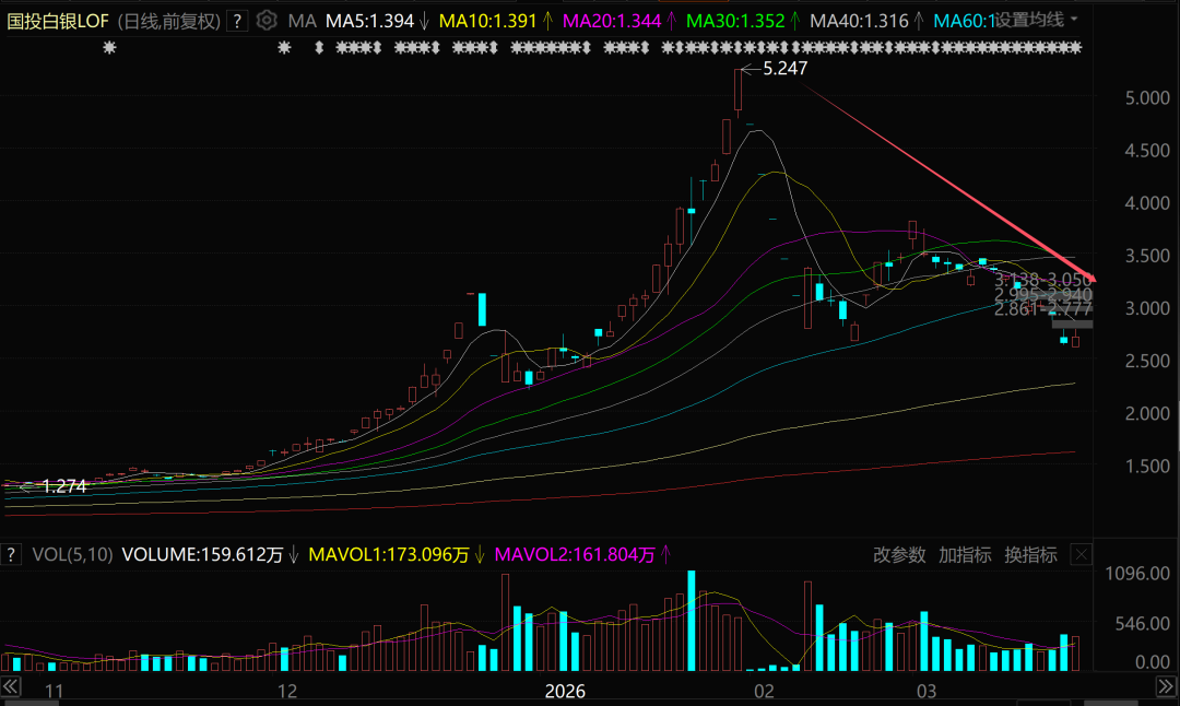 还记得昔日溢价率高到天际、被散户疯狂炒作的国投白银LOF吗?它自从3月份以来几乎每天都在下跌,较1月底的高点也几乎腰斩。