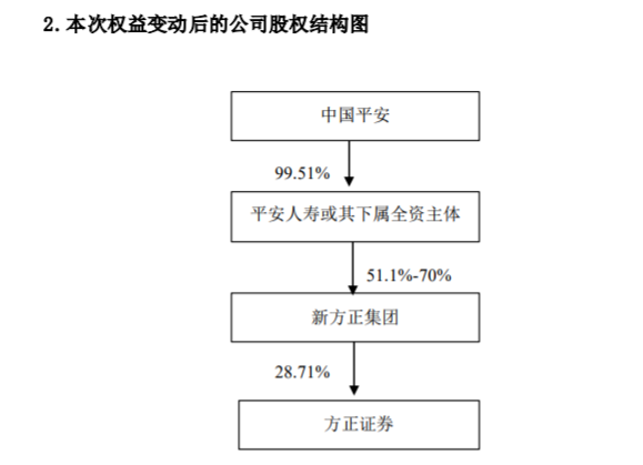 彼时,平安人寿或其下属全资主体拟按照70%的比例受让新方正集团73%-100%的股权,因此,平安人寿或其下属全资主体拟成为新方正集团的控股股东。中国平安作为平安人寿的控股股东,拟间接控制方正证券。本次权益变动后,方正集团及其一致行动人方正产控将不再持有方正证券的股份。