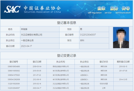中国证券业协会网站显示,林晓锋于2015年2月16日在方正证券股份有限公司登记的执业岗位为一般证券业务,随后机构内变更,于2023年4月17日登记的执业岗位仍为一般证券业务,目前状态为正常。