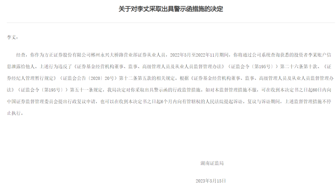 就在今天(2023年5月15日),湖南证监局新增一则罚单:当事人李丈在郴州永兴大桥路营业部任职期间,将通过公司系统查询获悉的投资者李某账户信息泄露给他人,被采取出具警示函的监管措施。