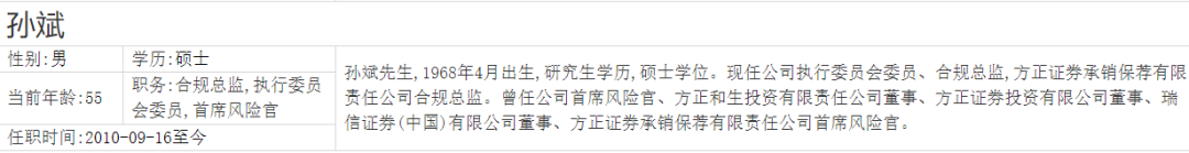现年55岁的孙斌先生,自2010年9月起任合规总监,至今已有12年。2022年,他的薪酬为221万元,在方正证券主要高管中排名中位。