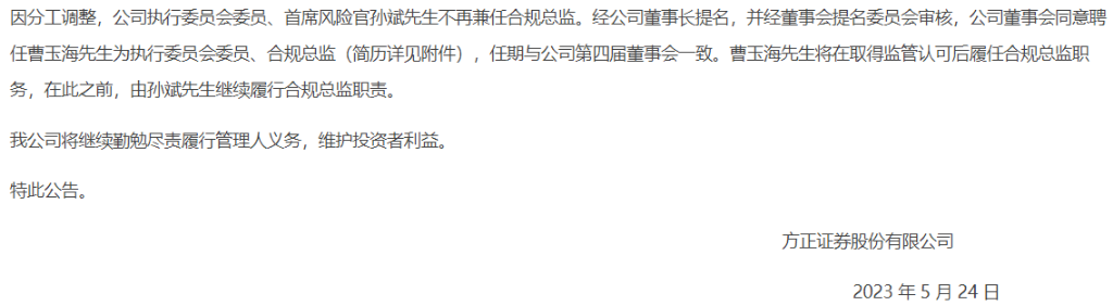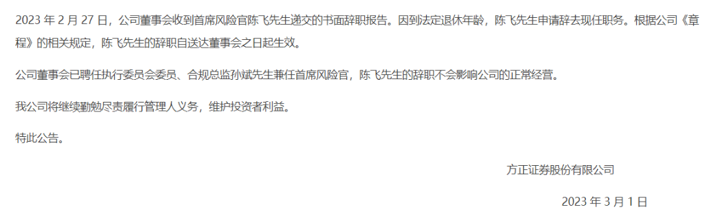 孙斌“接手”首席风险官一职的时间并不长,还不到三个月时间。2023年3月1日,方正证券前首席风险官陈飞因到龄退休离职。