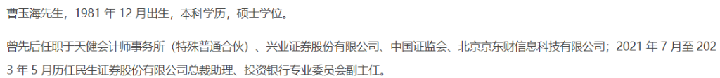 曹玉海本人为80后,从业经历比较“丰富”,过往任职单位包括兴业证券、监管机关和民生证券等。