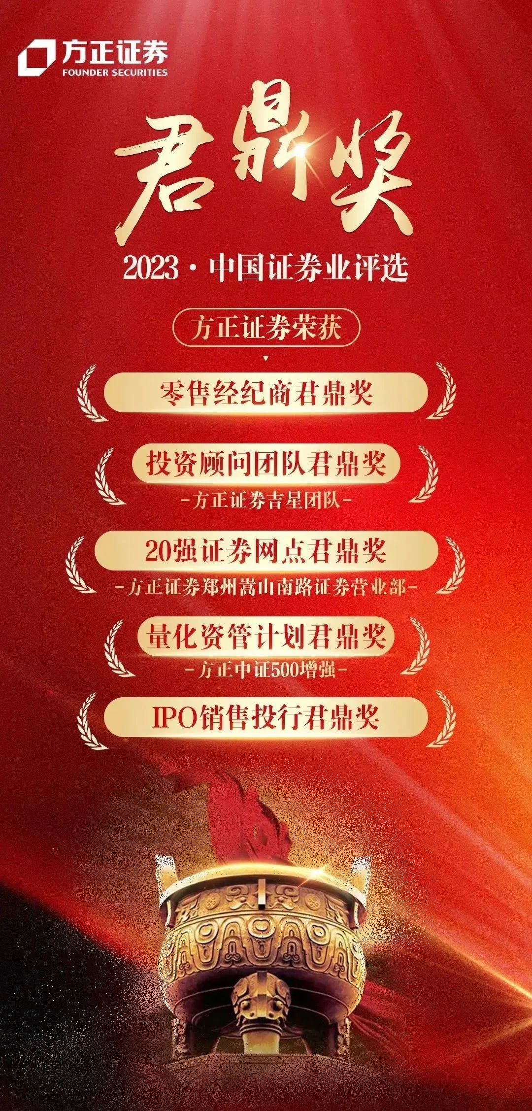 今天,由《证券时报》主办的“2023中国证券业君鼎奖”评选结果揭晓,方正证券荣获财富管理类、资产管理类、投资银行类共计5项大奖。