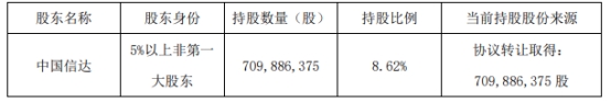 截至公告披露之日,中国信达持有公司股份数量为709,886,375股,占公司总股本的8.62%,股份来源为协议转让获得,为公司第四大股东。