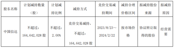方正证券(601901.SH)昨日晚间发布公告称,中国信达资产管理股份有限公司(简称“中国信达”)因公司经营需要,拟于公告发布之日起十五个交易日后的六个月内,即2023年8月23日至2024年2月22日期间,以集中竞价方式减持公司股份不超过164,642,028股,约占公司总股本的2.00%。