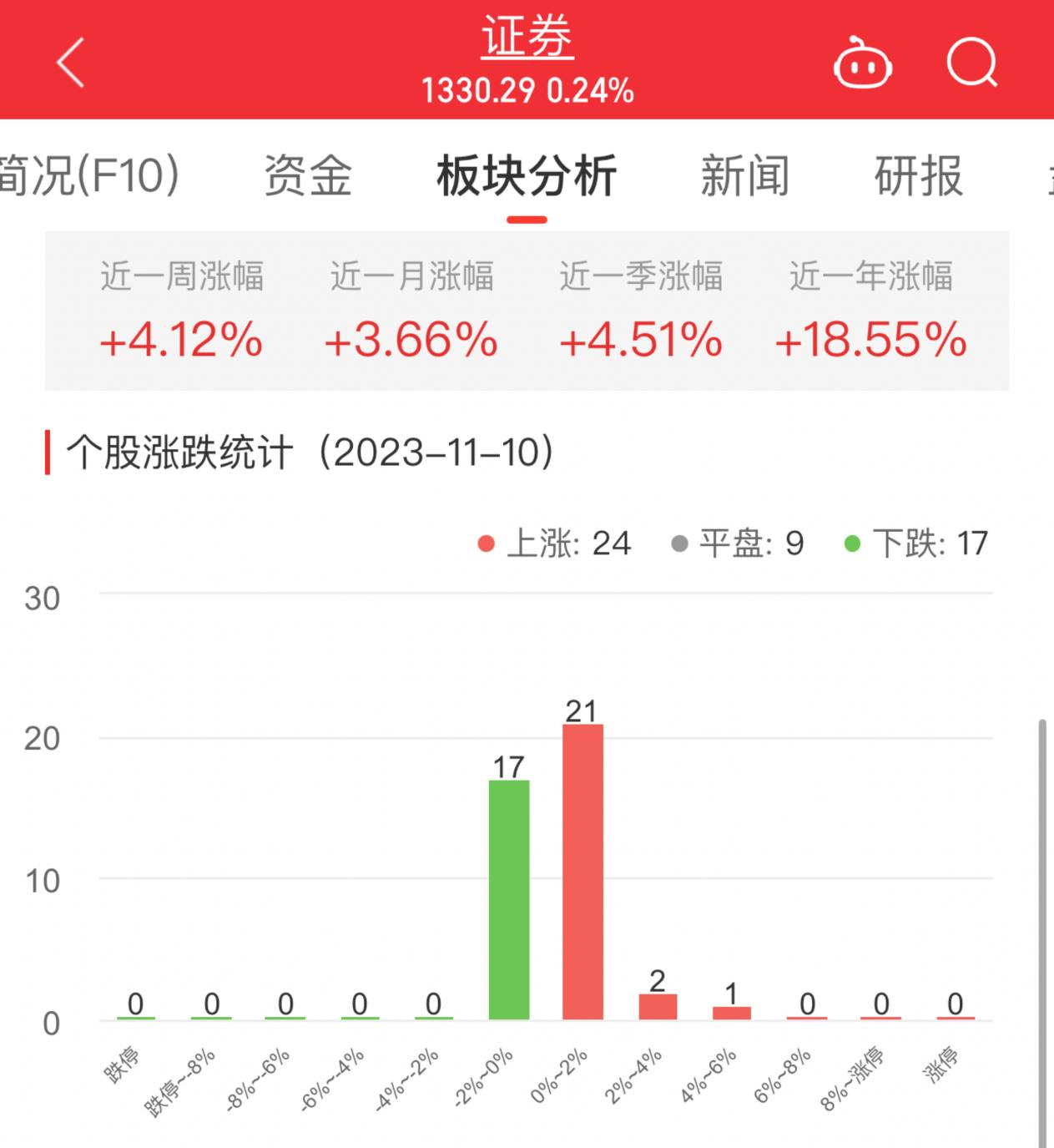 今日,证券板块整体涨幅0.24%,其中24只股票上涨,9只股票平盘,17只股票下跌。