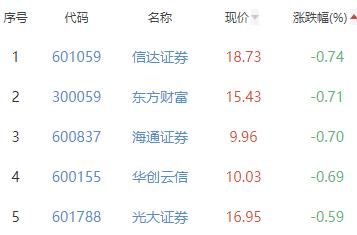 信达证券、东方财富、海通证券、华创云信、光大证券位列涨幅榜后五位,涨幅分别为-0.74%、-0.71%、-0.70%、-0.69%、-0.59%。
