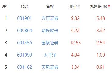其中,方正证券、哈投股份、国联证券、太平洋、天风证券位列板块涨幅前五位,涨幅分别为5.48%、3.32%、2.54%、1.00%、0.91%。