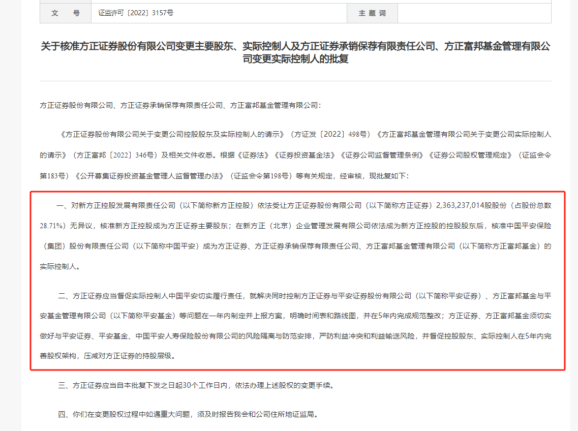 早在2022年12月19日,证监会发布《关于核准方正证券股份有限公司变更主要股东、实际控制人及方正证券承销保荐有限责任公司、方正富邦基金管理有限公司变更实际控制人的批复》,核准新方正控股为方正证券主要股东(控股28.71%),而中国平安则成为方正证券、方正证券承销保荐有限责任公司、方正富邦基金的实际控制人。